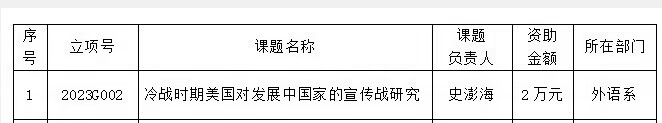 2023年陕西省社会科学基金年度项目现已完成受理申报、初评、终评、社会公示等工作程序,经省哲学社会科学工作领导小组批准,现已公布立项课题名单,外语系史澎海教授一项课题喜获立项,具体如下: