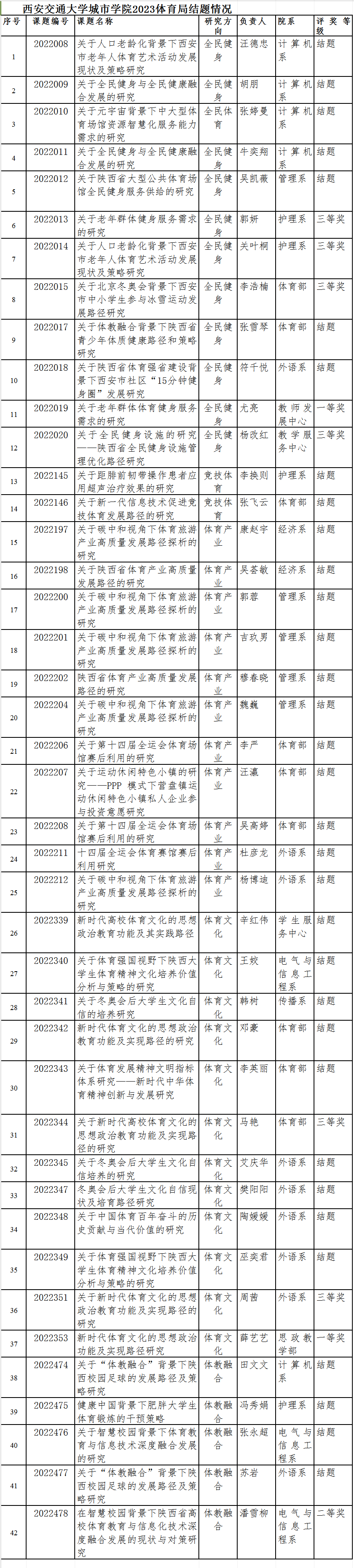 陕西省体育局公布了2023年陕西省体育局常规课题结题情况,我院42项课题完成结题,其中我系周茜老师获三等奖。评奖等级如下: