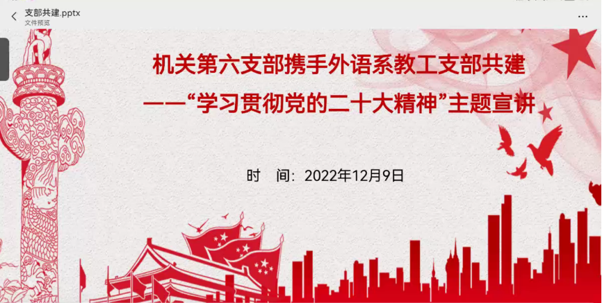 为深入学习贯彻党的二十大精神,12月9日下午,学院机关第六党支部、外语系教工党支部、外语系学生党支部在腾讯会议共同召开学习贯彻党的二十大精神宣讲报告会。本次报告会特邀思政部鱼晓辉老师主讲,外语系教工党支部与外语系学生党支部全体党员参加,会议由学院机关第六支部书记黄迎老师主持。