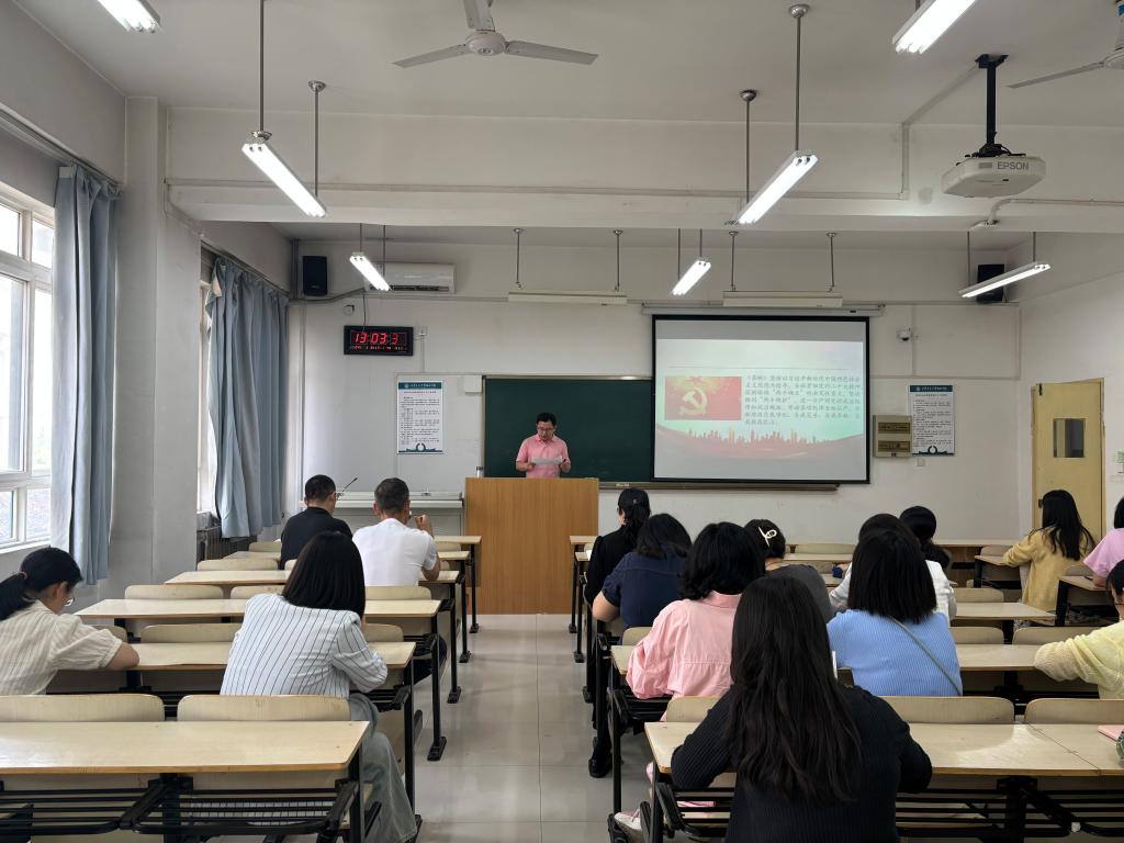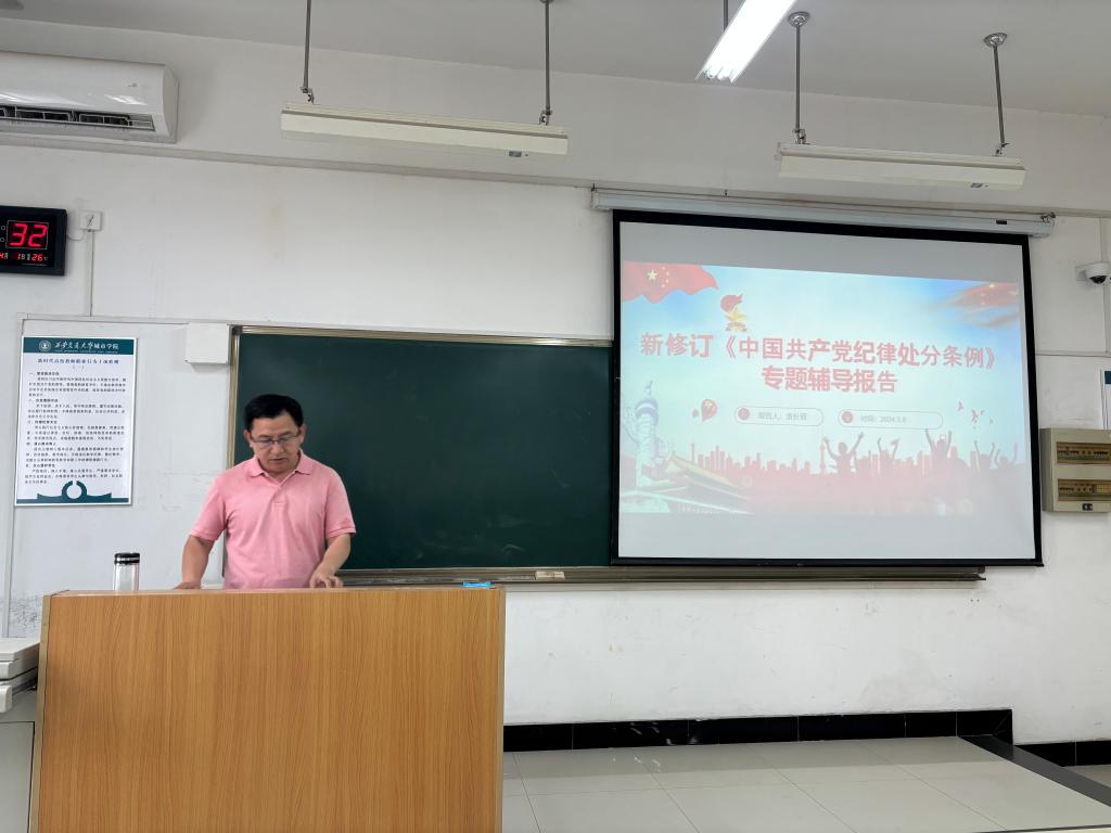 为深入开展党纪学习教育,加强党的纪律建设、增强党员的政治觉悟和纪律意识,5月8日下午,Beat365教工党支部在教学楼B316开展支部书记讲党课活动,支部书记袁长普为全体党员讲授主题教育专题党课,学习贯彻新修订的《中国共产党纪律处分条例》。