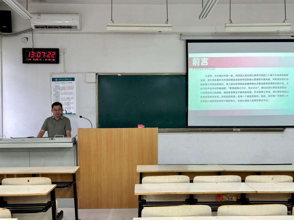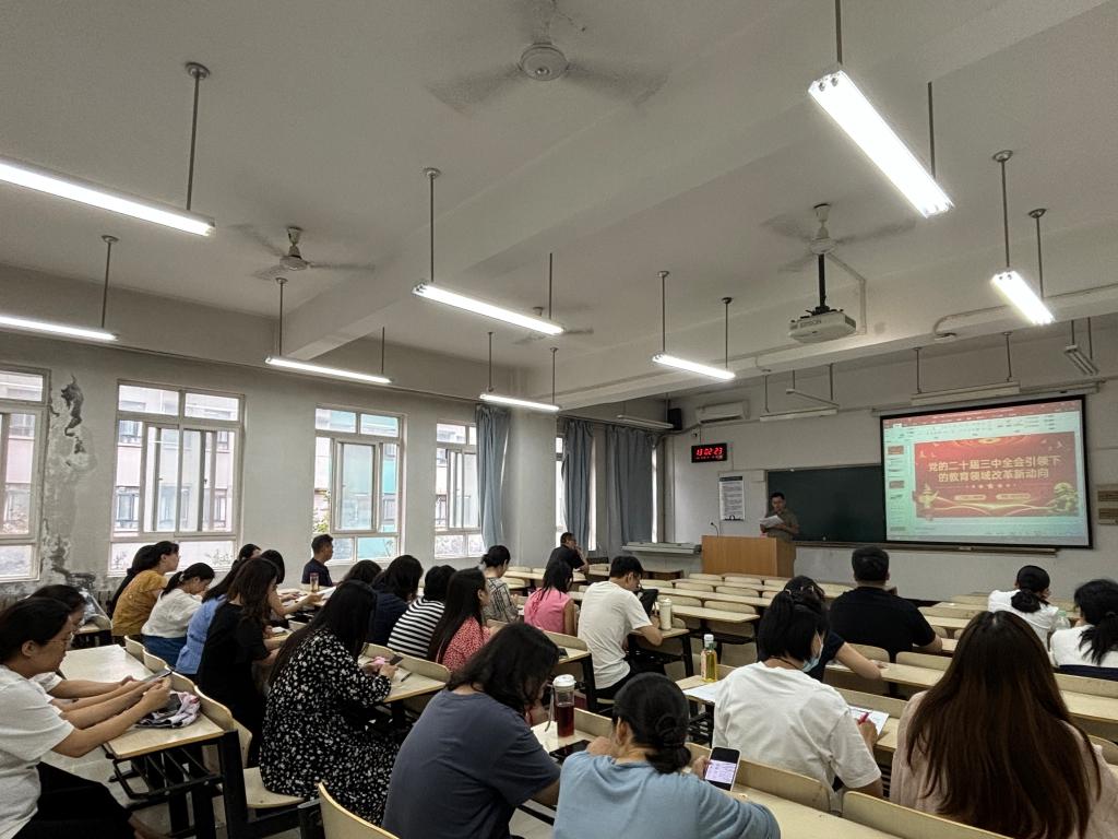 党的二十届三中全会是在以中国式现代化全面推进强国建设、民族复兴伟业的关键时期举行的一次十分重要的会议。支部书记袁长普提出,我们要全面学习并深刻领会全会所传达的核心思想和丰富内涵,同时结合我们当前教育工作的实际情况,深入探讨如何将全会精神转化为推动教育发展的实际行动。他以“党的二十届三中全会引领下的教育领域改革新动向 ”为主题,从以下三方面深入剖析解读了会议精神:第一,领会全会精神实质,明确教育改革方向;第二,深化教育体制改革,激发教育活力 ;第三,加强交流协作,推动高等教育改革与创新。他强调,党的二十届三中全会为我们描绘了一幅宏伟的教育改革发展蓝图。在这次会议中,我们要深刻认识到教育改革的重要性,以及它在国家发展中的核心地位。让我们携手并肩,共同努力,迎接各种挑战,全身心地投入到教育改革的伟大事业中去。党员们听得认真,记得仔细,不时点头表示赞同。