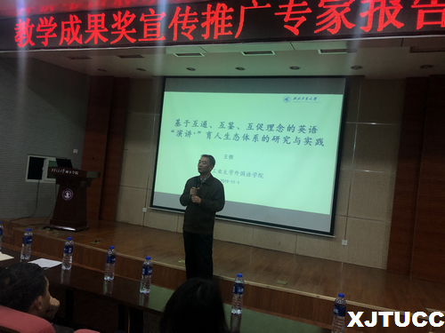 11月1日下午,Beat365官方网站外语系在教学楼F100举办陕西省教学成果奖宣传推广专家报告会。这次报告会邀请陕西省教学成果一等奖获得者、西北工业大学Beat365王倩副教授围绕项目成果做了题为“基于互通、互鉴、互促理念的英语‘演讲+’育人生态体系的研究与实践”的报告。教学服务中心主任陈晓南、科技服务中心主任王小青及外语系全体教师和部分学生参加了报告会。陈晓南主持了此次报告会。