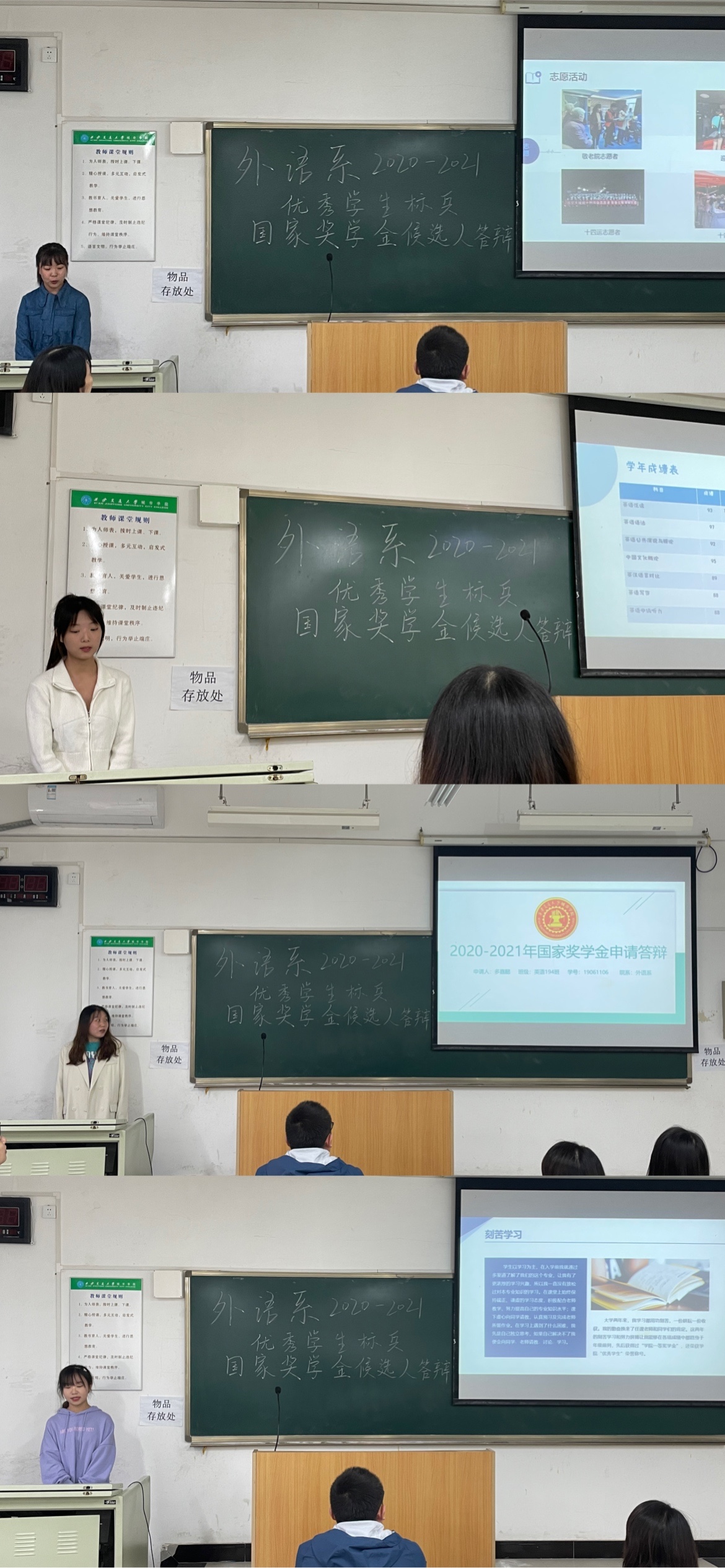 为全面落实评选学院优秀学生标兵和国家奖学金公平公正公开的程序,依据学院资助中心关于国家奖学金评选文件的通知,经过学生自主申请、系内初审,外语系于2021年9月27日下午在教学楼B319举办优秀学生标兵候选人答辩会,本次答辩的评审委员由外语系日语教研室吴夫迎、英语教研室胡婷、张一帆、学工负责人关天骄、辅导员韩蓉、刘牧原六名老师组成,大二至大四共有8名学生参加答辩。