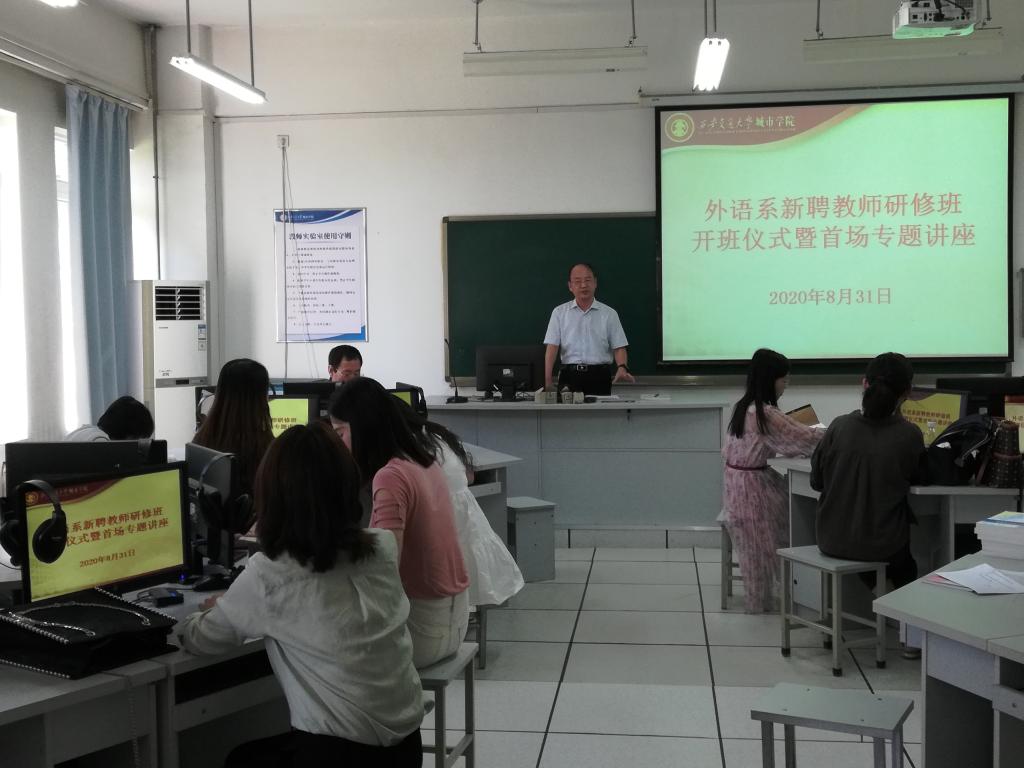 为提高新聘教师的专业能力,尤其是外语教学理论和实践能力,帮助他们尽快适应岗位,Beat365官方网站外语系于2020年8月31日下午在教学楼B311教室举办了新聘教师研修班开班仪式暨首场专题讲座。开班仪式由外语系赵永生副主任主持,首场专题讲座由系主任郭继荣教授主讲。系主任助理、办公室主任和全体新聘教师参加了开班仪式。