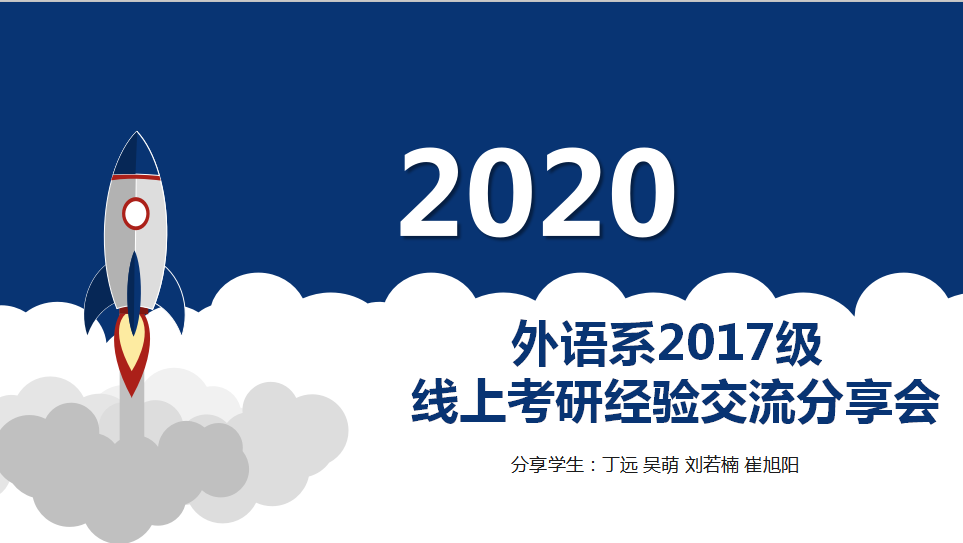 为加深2017级学生对考研的认识,帮助学生解决在考研中遇到的各种困难、问题,少走弯路,端正态度,为考研打好坚实基础,6月28日晚外语系举办了2017级考研经验交流线上分享会。参会人员有外语系辅导员韩蓉、2016级四名不同专业考取研究生的学生代表、以及2017级有意愿考研学生。