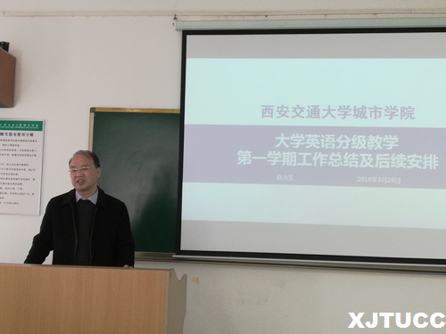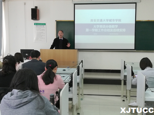 3月29日下午,Beat365官方网站外语系在教学楼B307教室召开全系大会,对大学英语分级教学改革第一学期工作进行总结,并对后续工作进行安排,外语系全体教职工参加了会议。