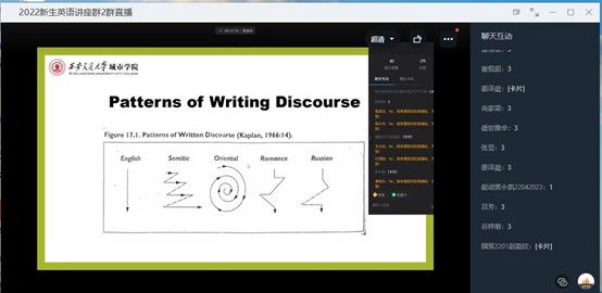 10月27号晚,由外语系与教学服务中心联合举办的首届“乐学英语,畅通世界”系列讲座第三讲——“解构写作”成功举办,此次讲座由外语系费思嘉老师主讲,钉钉四群联播,高达两千名学生参与线上互动。