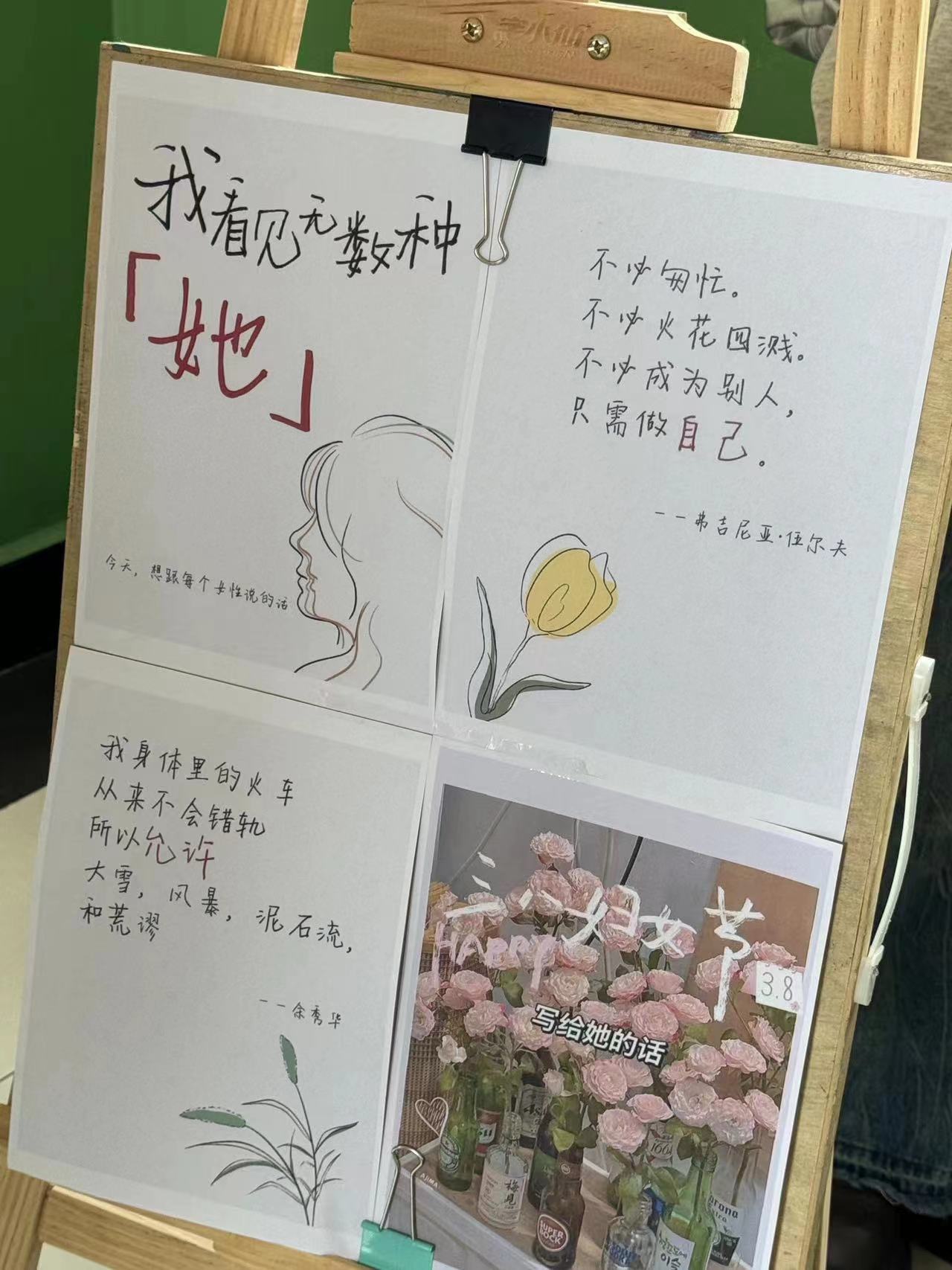 春和景明、万物生辉、阳春三月,又迎来了一年一度的“三八”国际妇女节。在学校里,女老师是当仁不让的主力军,她们勇挑重担,踔厉奋发,充分展现奉献的精神、拼搏的激情和强烈的责任心。她们在平凡岗位上,以新时代女性高度的事业心和爱校如家的主人翁责任感谱写了一曲曲“巾帼不让须眉”的美丽赞歌。