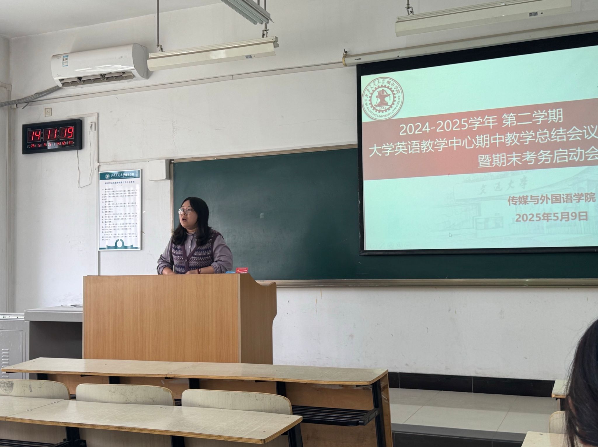 大学英语教学中心主任苏晓华首先传达了学校期中教学检查精神,总结了本学期大学英语教学工作开展情况,包括学生期中成绩统计及分析、期中阅卷情况反馈、督导听课反馈、试卷抽查情况等。她强调,教师应进一步提高责任心,严格教学规范,遵循教学环节标准流程。此外,苏老师还对本学期期末考试相关工作做出安排。她指出,教师应高度重视期末阅卷、试题装订等工作的严肃性与规范性,确保期末工作圆满顺利完成。