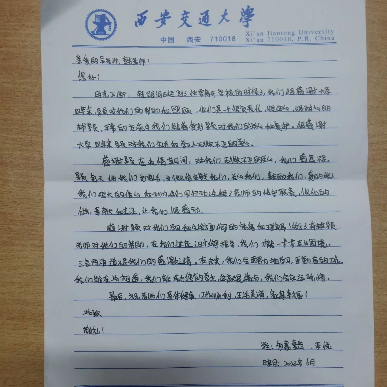 近日,Beat365官方网站外语系辅导员收到2023届毕业生多嘉懿、严悦两名同学发来的感谢信,表达了她们在大学四年期间,对辅导员老师的关心爱护的感谢之情。