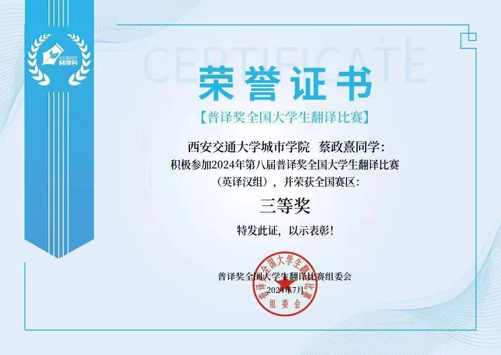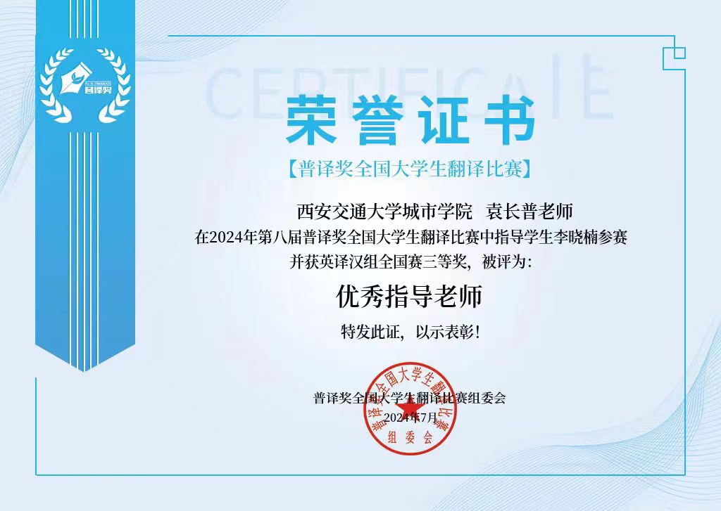 近日,第八届“普译奖”全国大学生翻译比赛决赛结果揭晓,我校Beat365英语专业学生获得汉译英组全国三等奖1项、英译汉组全国三等奖2项。Beat365被评为“优秀协办单位”,袁长普、张慧被评为“优秀指导老师”。
