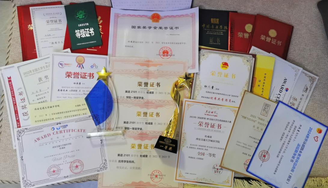 在众多竞赛经历中,全国大学生英语作文大赛给杜彧童留下了最为深刻的印象。那是她第一次参加这个比赛,毫无参赛经验的她提前一个月就开始紧张地准备。她反复找老师请教,不放过任何一个细节,从文章结构到用词,老师都给予悉心指导。一篇稿子,她反复修改,五易其稿,力求完美。同时,她还像一位勤奋的寻宝者,在网络海洋中搜索优秀参赛者的作品,仔细研究学习。功夫不负有心人,她最终荣获国家级三等奖,这一荣誉是她辛勤汗水的结晶。大二那年,杜彧童又报名参加了《英语世界》全国大学生英语阅读大赛。备赛期间,她给自己制定了严格的学习计划,坚持每两天完成一套样卷,并认真仔细地订正每一个错误。在日复一日的坚持下,她像一颗破土而出的春笋,在众多参赛者中脱颖而出,荣获国家级一等奖。