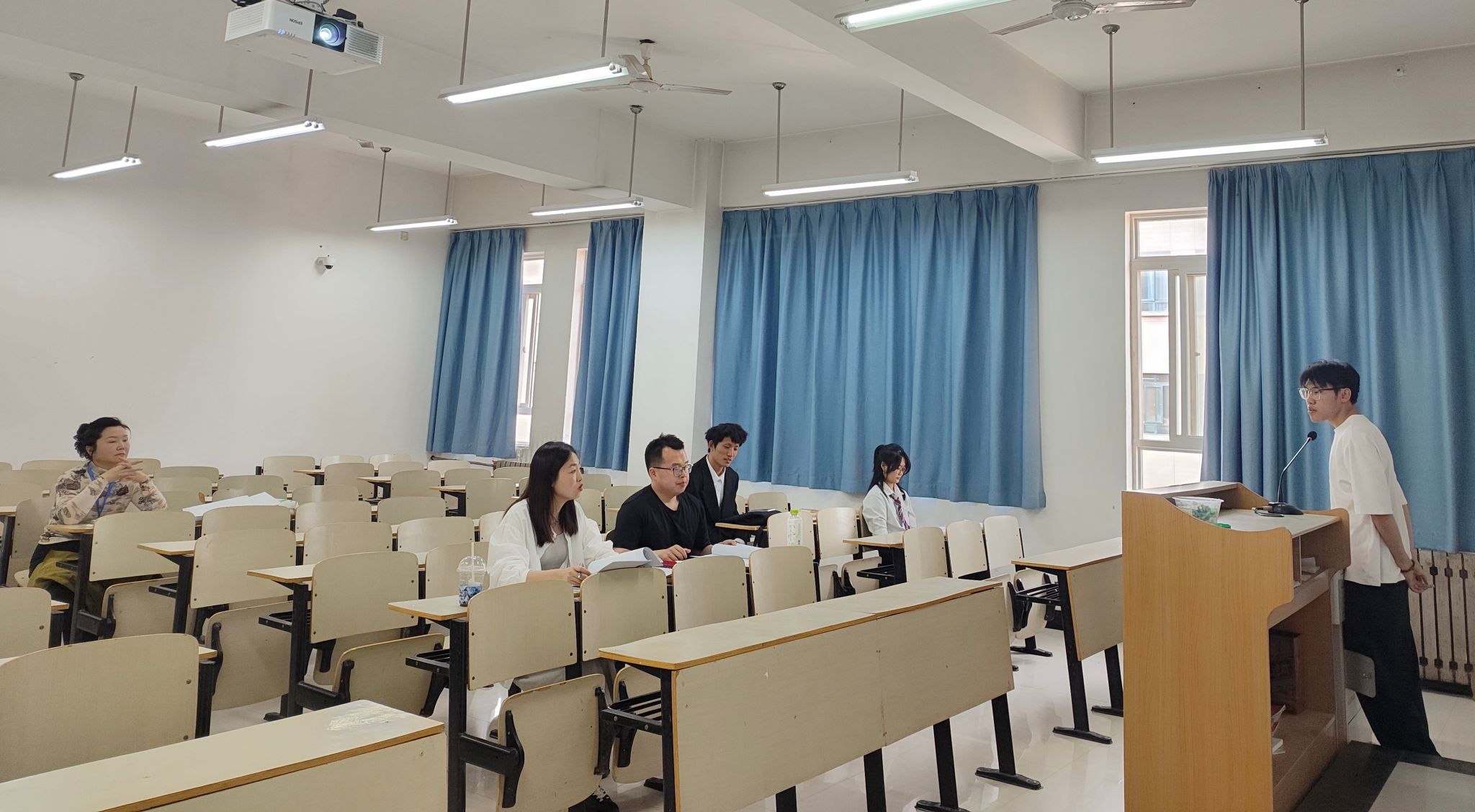 外语类专业于4月11日在教学楼B楼设立五个分会场进行中期答辩,共抽取20名毕业生参加。学生们围绕翻译实践、教学实践、学术研究等多元化选题,通过PPT展示详细汇报了论文进展。由外语系骨干教师组成的评审团队,从学术规范、研究方法、逻辑结构等维度提出了针对性建议。