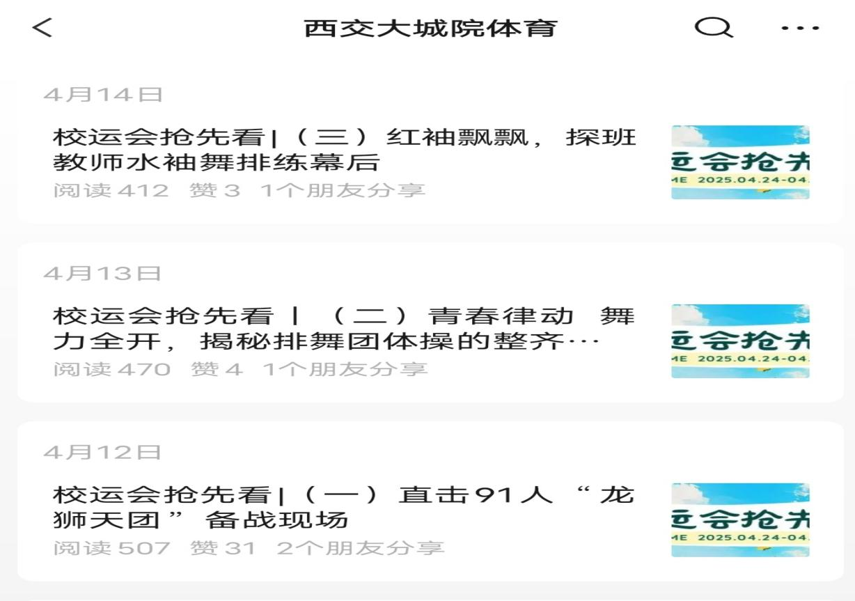 自3月下旬起,课程组高宇、雷雨、吴璇三位教师带领学生组建12个融媒体创作小组,围绕校运会筹备开展全流程实战。学生分组承担出镜记者、摄像、剪辑、文案等岗位,完成选题策划、采访拍摄及后期制作,系统掌握全媒体生产技能。系列作品通过“西交大城院体育”“西交城院Beat365官方网站”微信公众号发布,累计阅读量突破5000人次。