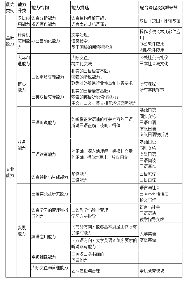 本专业旨在培养具有扎实的日语语言基础和较强的跨文化交际能力,同时又具备广泛的自然和人文社会科学知识,能在企业、教育、外经贸、文化和新闻出版等部门从事翻译、教学以及对外贸易等工作的高素质复合型日语人才。